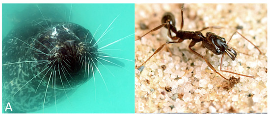 Figure 3. Hairs and hair-like structures aid in prey capture and foraging. (A) Harbor seal (Phoca vitulina) facial vibrissae, with a caudal curvature to their whiskers. These hairs aid in both navigation and foraging to detect the movement of prey (image modified from [109]). (B) Worker trap jaw ants (Odontomachus brunneus) use their powerful mandibles to capture food or escape danger. Hair triggers enable rapid closure of these mandibles image modified from [110]).