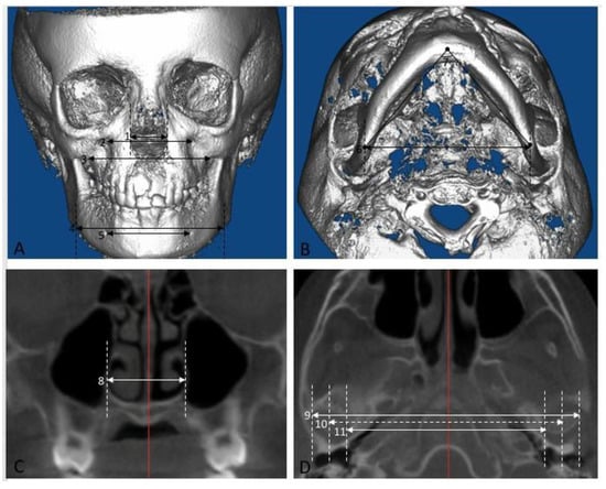 Skeletal measurements. The transverse width of various non-tooth-bearing areas of the maxilla and mandible was measured (“Skeletal measurements”). (A) 1. Anterior nasal width, 2. Io-Io, 3. Mx-Mx, 4. Ag-Ag, 5. Mf-Mf. (B) 6. Go-Go, 7. Gonion triangle. (C) 8. U6 nasal width. (D) 9. Cd- Cd lateral, 10. Cd-Cd middle, 11. Cd-Cd medial.