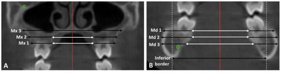 Dentoalveolar Measurements. (A) A coronal section at the mesiodistal midpoint of the maxillary first molar. The transverse width was measured at Mx 1, Mx 2, and Mx 3 at 2, 6, 10 mm apical to the U6 CEJ respectively. (B) A coronal section at the mesiodistal midpoint of the mandibular first molar. The transverse width was measured at Md 1, Md 2, Md 3 at 2, 6, 10 mm apical to the L6 CEJ respectively and inferior border. The black arrow shows the buccal transverse width, and the white arrow shows the lingual transverse width. The coronal and axial cross sections at which measurements were completed on the T2 image were identified by using the infraorbital and mental foramina.