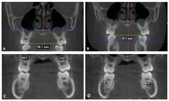 The molar inclination was measured as an angle formed by the long axis of the molar and true horizontal in a single coronal section. The long axis was identified by the mesiodistal and buccolingual center at the furcation and the deepest point of the occlusal table on the coronal section as previously described by Alkhatib and Chung []. The inner angle was measured for both maxillary and mandibular first molars (Figure 4C,D).