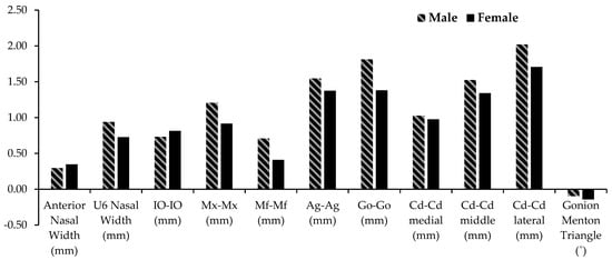 Table 1 and Figure 5 show the average annual changes for the transverse width of non-tooth-bearing skeletal structures of the face in males and females. All measurements except the gonion-menton triangle described the annual increases (p < 0.05). The gonion-menton triangle showed a slight annual decrease, but it is not statistically significant (p > 0.05). Among the maxillary and mandibular skeletal measurements, the anterior nasal width displays the smallest annual increases at 0.30 and 0.35 mm/year for males and females, respectively. The nasal width increases more posteriorly (U6 nasal width) at 0.94 and 0.73 mm/year for males and females, respectively. The intermaxillary width (Mx-Mx) has the largest annual increase of the maxillary transverse measurements at 1.21 and 0.92 mm/year in males and females, respectively. The inter-infraorbital foramen width (Io-Io) increases 0.73 and 0.81 mm/year in males and females, respectively. The inter-mental foramen width (Mf-Mf) increases 0.71 and 0.41 mm/year in males and females, respectively. Io-Io, Mx-Mx, and U6 nasal width increase significantly more than Mf-Mf in females only.