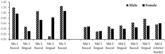 Dentoalveolar transverse changes per year at the first molar level of the maxilla and mandible for Males (stripes) and females (solid). Three coronal levels apical to the CEJ were examined. Mx/Md 1 is the most coronal level and Mx/Md 3 is the most apical level.