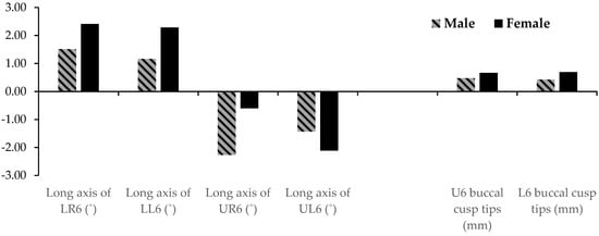 The maxillary and mandibular molars uprighted with age in agreement with Yang and Chung [] and Alkhatib and Chung []. Both studies also reported greater uprighting of the mandibular molars than the maxillary molars to compensate for a greater transverse increase of the maxillary dentoalveolar process than the mandibular dentoalveolar process. In the female group of our study, only the LR6 uprights more than the UR6 (p < 0.05). The LL6 shows more average uprighting than the UL6, but this is not statistically significant (p > 0.05). In males, there was no statistically significant difference in lower versus upper molar uprighting, which may be due to the small sample size. Greater sample sizes could yield more information on differential molar uprighting in the maxilla and mandible as well as different bucco-lingual molar inclination among various facial types [].