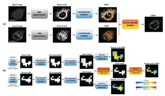 Flowchart of cDDM creation pipeline for a couple of markers. (a) The acquired images are segmented in binary masks and their pixel connectivity separately explored by local density analysis for the two pseudo-color DDMs building. Then, the cDDM is built through local co-density analysis, by comparing the single markers DDMs pixelwise. (b) Details of local density (blue boxes) and co-density (orange boxes) analyses: after setting the search (moving) windows size, each foreground (FG) pixel of each binary mask is assigned a number representing the amount of FG pixels in its locality, this constituting the input to build the pseudo-color DDM (here shown with no “saturated” densities). Then, the local co-density analysis is performed by pixelwise subtraction of the two DDMs.