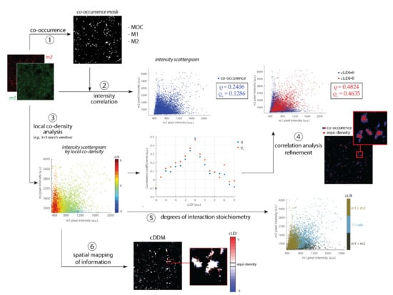 Colocalization can be defined as the functional and non-spurious co-presence of molecules, most commonly at the single-pixel level. While co-presence can be easily assessed, its functionality must be inferred by other measures, such as signal correlation. However, correlation between coexistent signals does not prove, but only suggests, the presence of colocalization. Such a suggestion can be then corroborated by local co-density analysis that, working locally, improves the information of co-location and, being in an order relation with correlation coefficients, can serve to improve the specificity of colocalization analysis. The main functional implications of cDDMs are schematized in Figure 2.