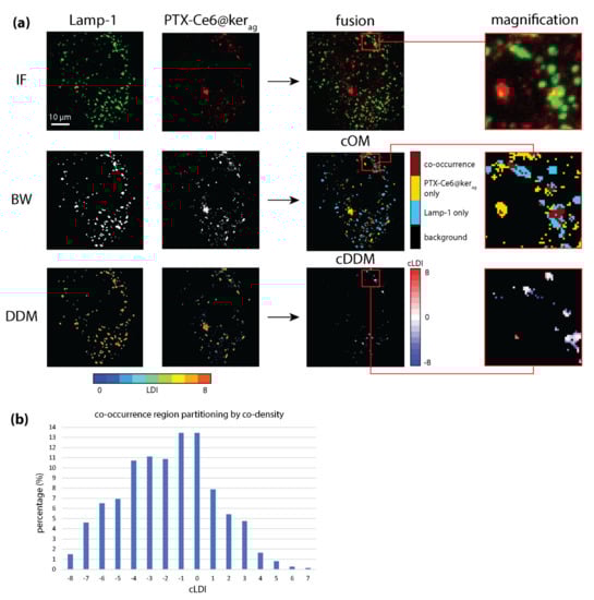 cDDM discloses information about the degree of colocalization. (a) Top: Exemplificative immunofluorescence (IF) images of MG-63 cells exposed to PTX-Ce6@kerag nanoparticles, marked against late endosomes (Lamp-1), with Ce6 (NPs), or both (fusion). Middle: Lamp-1 and Ce6 signals’ binary masks (BW), whose combination produce the co-occurrence map (cOM). Bottom: Lamp-1 and Ce6 DDMs and cDDM. (b) Bar graph of co-occurrence region partitioning by co-density, showing a prevalence of negative cLDI values that indicate NPs as generally denser than late endosomes.