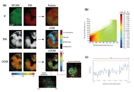 cDDM opens to the formulation of new biological considerations. (a) Top: Exemplificative immunofluorescence (IF) images of rats’ spinal cord, marked against the axonal (NF200), the myelin (FM) components of the cord, or both (fusion). Middle: NF200 and FM signal binary masks (BW), whose combination produce the co-occurrence map (cOM). Bottom: NF200 and FM DDMs and cDDM. (b) Scattergram of NF200 and FM signals intensity color-coded by cLDI, showing a clear prevalence of equi-density pixels (grey, cLDI = 0). (c) The line plot reports the cLDI values underlying the horizontal red arrow (x) inside the “motor pathway” magnification. The cLDI medio-lateral distribution is shown in function of the pixel distance (d, yellow line) from the dorsal median sulcus (DMS, white line), highlighting a progressive myelin thinning from spinal cord center to periphery.