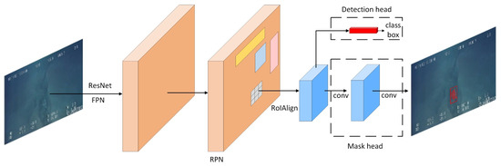 Mask R-CNN is based on Faster R-CNN and combines ResNet [30] with FPN as a feature extraction network to obtain the feature map by multi-layer convolutional feature extraction of the image. Then, the Region Proposal Network (RPN) is used to generate proposal of regions for the object. Finally, object detection and instance segmentation are achieved by detection head and mask head.
