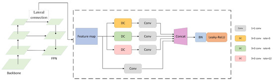 Unlike the traditional FPN, which only uses one 1 × 1 convolution in the lateral connection, the improved network adds three dilated convolutions, i.e., 3 × 3 conv with sampling rates of 6, 12, and 18, to sample the feature maps. The structure is designed to capture the feature information of the image at multiple scales. Then, the feature map is downscaled by 1 × 1 conv and concatenated with the original feature map to obtain more image features. Finally, the channel number of the feature map is decreased to our desired value by using 1 × 1 conv, and the results are input sequentially into the BN layer with the Leaky-ReLU function in order. In this way, we can achieve the feature fusion in the lateral connection in FPN. This operation enhances the ability to extract features from low-resolution images while ensuring no problems such as gradient explosion or disappearance. Experiments show that using this lateral connection structure based on dilated convolution makes image features easier to extract. This is used to achieve more accurate target localization and classification, which results in a better instance segmentation effect.