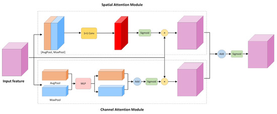 Similarly, the spatial attention module performs channel-based global max pooling and global average pooling on the input feature maps. The two H × W × 1 feature maps are obtained, and then, the two feature maps are concatenated based on channels, and the channel number of the feature maps is reduced to 1 using 7 × 7 convolution, i.e., H × W × 1. The same sigmoid function generates the spatial attention feature, i.e., M_s, and multiplies it element-wise with the input feature map to obtain the feature map with spatial information. These add up the final feature maps from the two modules. Finally, the channel number of the feature map is reduced by 1 × 1 convolution. Thus, feature fusion based on both spatial and channel dimensions is achieved, providing more valuable features for subsequent network modules.