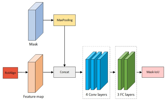 To solve this problem, we divide the score of the mask into the classification score and the score of Intersection over Union (IOU). Through the training of the network, the IOU between the ground truth and the predicted mask is calculated, as well as being continuously optimized to improve the accuracy of the instance segmentation. Since the classification score can be calculated from the R-CNN head, the re-scoring branch is introduced. The network structure is shown in Figure 4.