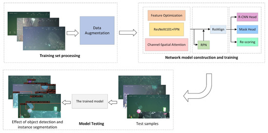 Since the marine environment is complex, and most algorithms are not applicable in this scenario, many experimental results have been relatively poor. To solve this problem within the task of object detection, Tan [24] proposes using a deep proposal mechanism (DPM), which can achieve a high-performance, complex object detection. Chen et al. [25] propose a novel module called an adaptive convolution block (ACB). Due to such adaptive convolution, the enhanced features can pay more attention to the relevant objects, suppress the interference information caused by irrelevant surroundings, and efficiently improve the detection accuracy. Sun et al. [26] propose a unified part-based convolutional neural network (PBNet). It treats a composite object as a group of parts and incorporates part information into context information to improve composite object detection. Sun et al. [27] constructed a Mask-SSD network, increasing the SSD performance for detecting target objects of small size by enhancing detection features with contextual information and introducing a segmentation mask to eliminate background regions. Wu et al. [28] have proposed a new pipeline for salient end-to-end instance segmentation (SIS) that predicts a class-agnostic mask for each detected salient instance. Tian et al. [29] applied the U-Net backbone to Mask scoring R-CNN. By improving the processing ability of image boundary pixels, the effect of instance segmentation is optimized.