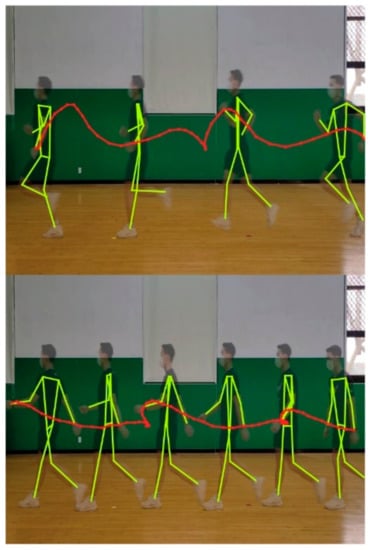 An example of the different hand motions affected by walking strategies: running (upper) and regular walking (bottom). The position of the left hand is highlighted and connected by a dotted line. Note that walking strategies significantly affect the hand motions while walking (e.g., spatiotemporal walking parameters, such as the speed and intensity of the waving arm). Here, the poses overlayed on the pictures have been extracted based on a recent work [23].