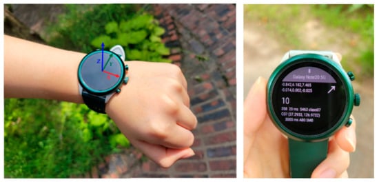 In the data collection process, we used a consumer smartwatch (DW9F1 by Fossil Group, Inc., Texas, USA) as the sensing device and a smartphone (Galaxy Note 20 by Samsung Electronics Co. Ltd., Korea) as the host device. For the smartwatch, we developed a custom application to capture the inertial movements of the hand in the form of MTS data using Wear OS by Google. Here, sensor values from the built-in motion sensors (e.g., triaxial accelerometer and gyroscope) were captured at every 20 ms. For the smartphone, we developed a custom host application to manage smartwatch application remotely over the Bluetooth low-energy (BLE) connection. With the host application, the experimenter can assign a label to the motion, take notes for the experiment, and control the start and end of the capture process remotely. Figure 2 shows the smartwatch device used in this study (left) and an example of the custom application running on the smartwatch (right).