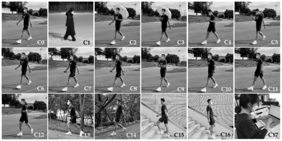 Example photographs taken to describe the 18 different walking styles defined in Table 1. Class index is displayed at the bottom-right corner of each picture. Class #C17 (i.e., doing something while sitting and standing) was added as the reference class.