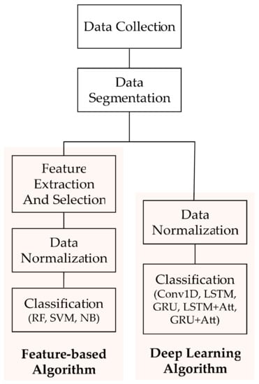 Given the MTS input data , the machine learning systems for activity recognition attempt to estimate , i.e., a type of activity from a predefined set of activities. Here, represents the t-th measurements, T and D (=6 in our case) represent the length of the signal and the dimension of the sensor data, respectively, and M denotes the number of activity types. Figure 4 shows the pipeline of the machine learning process used in this study.