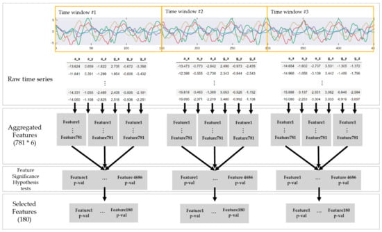In the feature-extraction process, a comprehensive number of features (e.g., 4686 = 781 × 6 features in our case) was extracted from the segmented MTS signal . We then selected the 180 most-significant features. Here, approximately 30 features could be extracted for each axis based on the significance hypothesis test. The entire feature extraction process is illustrated in Figure 5, and Table 4 shows the 12 most significant features based on the results of the feature significance hypothesis test.