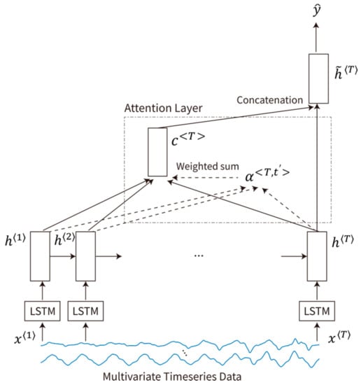 Here, is a bilinear function, which compares the two hidden states, and is the trainable weight matrix of attention. The length of the alignment score is . Differing from attentional encoder–decoder problems [45,46], in our classification problem, is the last hidden state of the encoder network because our problem does not involve any decoder structure. A similar approach was used in recent studies [48,49].