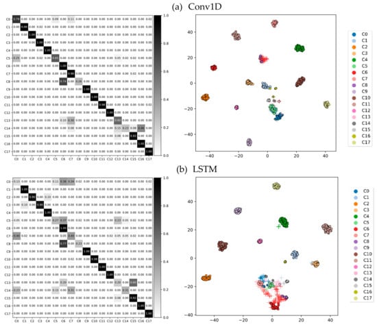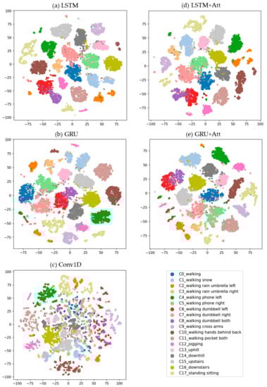 We also examined the high-dimensional internal features (D = 64 in our case) learned by our deep neural networks, such as Conv1D, LSTM, GRU, LSTM + Att, and GRU + Att, using t-distributed stochastic neighbor embedding (t-SNE) [51]. The two-dimensional embeddings projected from the last fully-connected layer are shown in Figure 8.