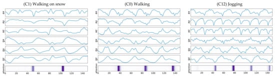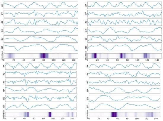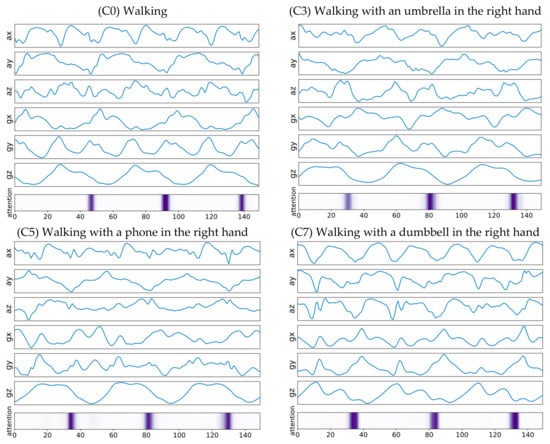 However, as we said in Section 5.1, our system is unable to detect all walking behaviors during the blind test. C8 (p: 100.0/86.667, r: 26.316/22.807 when Conv1D/LSTM were used) was, for example, mistaken with C6 (p: 46.213/29.605, r: 100.0/100.0 when Conv1D/LSTM were used). This could be because typical motion aspects (for example, swinging the left arm slowly due to a heavy load in the left hand) are invariant to right-hand motion. Figure 13 exhibits example input signals with attention weights aligned when our system misidentified C8 as C6 during the blind test. In contrast to Figure 10 and Figure 11, which show examples of when the recognition process was correct, attention weights are not routinely and densely formed in Figure 13.