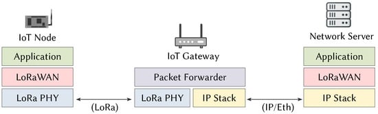The architecture and operations performed by an IoT network using LoRa/LoRaWAN technology have been described in detail [,,,,,]. The topology is star of stars, as shown in Figure 1. IoT nodes or End Devices (EDs) form the sensor network and are positioned as closely as possible to the physical environment. They interact with the medium and transmit data to one or more GWs using a wireless link with LoRa modulation. GWs perform a protocol transition in order to facilitate the communication from the wireless sensor network to the network server. Application servers store data and offer new services to the users. The network server administrates and secures the data transmission from the EDs.