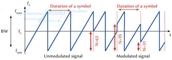During the development of a frame, the transmitter carries out a number of processing operations to improve the robustness of the signal and to increase the sensitivity of the receiver. In particular, an Error-Correcting Code adds one to four cyclic redundancy bits to each 4-bit packet of data. The resulting binary data blocks are then grouped together to form SF-bit symbols (SF denotes the spreading factor) that modulate an up-chirp signal by frequency hopping [,,]. Figure 4 shows an example of this modulation, where is the carrier frequency. On the left, it is an unmodulated sinusoidal up-chirp signal whose frequency varies proportionally over time. When it reaches the high frequency , it switches to the low frequency . On the right, several symbols have been modulated, each containing SF bits (the number of possible value is ). In this example, the spreading factor SF is 7 and the numerical value can range from 0 to 127. Downlink frames transmitted by the GWs to the EDs are done using inverse polarization [].