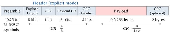 Figure 6 shows a LoRa physical layer frame. It contains a header, a payload and an optional 16-bit CRC calculated on the payload. The physical header begins with the preamble, which is required for receiver synchronization. In Europe, the size (NP) is eight up-chirp symbols, followed by two symbols containing the network identifier, called the synchronization word (SW), and 2.25 down-chirp symbols. The rest of the header is not required in implicit mode. In explicit mode, an 8-bit field defines the length of the payload, a CRC bit indicates if the optional CRC is presented at the end of the frame, a 3-bit field contains the CR value used to encode the payload, and an 8-bit CRC is calculated on the header. The payload, from 0 to 255 bytes, contains the MAC header and the MAC payload as shown in Figure 7.