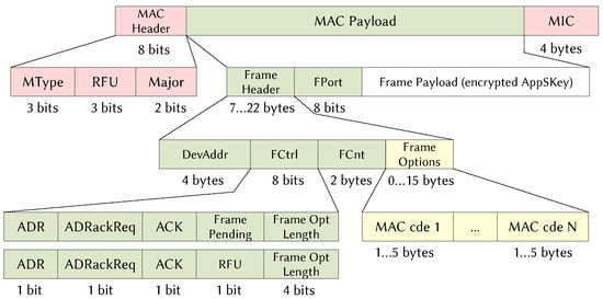 Three fields comprise the MAC header: the MAC type, the RFU for a future use, and the major field that indicates the protocol version. The 4-byte MIC field is used to check data integrity. In the MAC payload, the Frame header contains information about the data. FPort, DevAddr, FCtrl, FCnt, FOpts are, respectively, the service port, the address of the ED, information about the transmission, the frame counter and MAC commands transmitted by the network server to manage the communication of an ED. For the rest of the study, and for the sake of simplification, we consider a constant load of 50 bytes for the data frames and a physical explicit mode header. According to the standard, ACK frames are load-free at the application layer and there is no CRC at the physical level. The considered elements are summarized in Table 4.