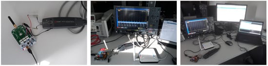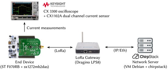 The current consumed and the time spent by a LoRa circuit in the different operating states were measured. An end-to-end LoRaWAN communication between one sensor node and a network server was implemented. Figure 8 and Figure 9 show the testbed. The current analyzer was a Keysight CX3300 with a CX1102A dual channel current probe.