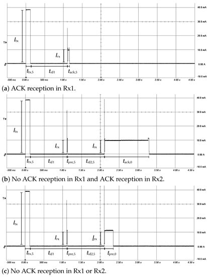 Figure 10 shows the measurement results of the current consumed by the node in a communication phase when the ACK was received in the first reception window (a), when the ACK was not received in the first reception window but in the second reception window (b) and when no ACK was received by the node (c).