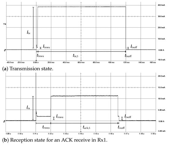 These figures show the measurement results for various operating states. In each case, the circuit begins by positioning itself in a transmission state followed by one or two idle and reception states. Transmission and reception durations (, , ) depend on the DR mode used by the node and its location. If an ACK is received in the first receive window, the equipment does not open the second receive window (Figure 10a). If the network server does not send an acknowledgment or if it is not received by the node, the latter stays in the reception state for a time less than or equal to the duration of the preamble and open a second receive window (Figure 10b). Finally, if an ACK is not received in the second receive window, the node stays in a reception state only during a preamble (Figure 10c) and goes to sleep mode. Figure 11a details the moment when the sensor is in a transmission state and Figure 11b when the sensor is in a reception state. Each event starts with a wake-up and finishes with the standby of the circuit.