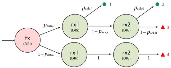 where , , and denote the average energy consumed by the node for a successful transmission (● 1, ● 2), the average energy consumed by the node for a failed transmission (▲ 3, ▲ 4), the probability of a successful transmission and the probability of a failed transmission, respectively. According to Figure 12, the probabilities and are determined by: