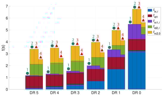 where and denote the initial DR used by the sensor for its first transmission attempt (note that depends on the distance) and a coefficient that allows us to adjust the calculation to the number of phases in order to respect the operation established in the state graph (Figure 12), respectively.