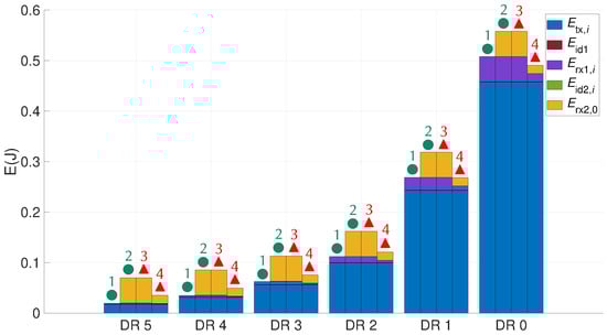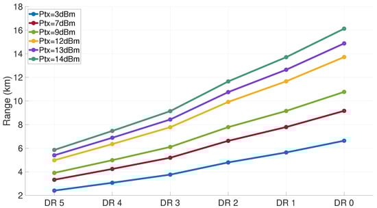 In this energy consumption model, (2) allows us to determine the SF used by the sensor for its first transmission attempt. Figure 16 shows the variation of this range as a function of the DR and the transmission power, for a loss exponent equal to three. The range of the signal increases when the DR mode decreases. A sensor located less than 4 km from the gateway can transmit using all the SF (note that the best efficiency is reached for DR5). A device located more than 10 km away can only use the SF12, corresponding to DR0. In our model, we compute the distance between the node and the gateway to determine the DR used by the node on its first transmission attempt, which corresponds to in (23).