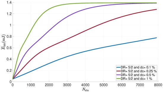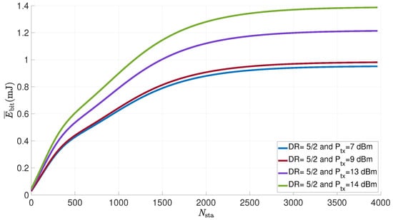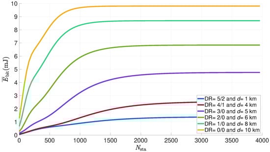 The analytical model given in (23) corresponds to the average total node energy consumption. Then, the average energy consumption by useful bit can be defined by . Table 7 shows the probability that the considered node uses a specific SF. This probability is used to obtain the number of sensors using each DR. Then, the error and collision probabilities are obtained from the EDs’ distribution in the network. Thus, if the number of nodes in the network increases, the probabilities in Table 7 involve an increase of the number of nodes using the same DR, and then an increase of the collision probability. Subsequently, (10), (12) and (13) are used to determine the success and failure probabilities based on this distribution and, finally, (23) is used by varying different input parameters: