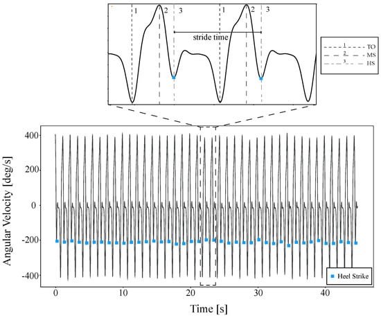 The first step in analyzing data is to ensure that the data is correct and cleaned. Therefore, the fourth main cleaning step was proposed. First, the gyroscope and accelerometer outputs were treated with a second-order low-pass filter Butterworth for noise removal [,]. Second, the collected data were visualized to check any additional erroneous data (e.g., faulty sensor values (too high and too low)), i.e., data that were not corrected through the automated filtering in the previous step. Third, the data from the different sensors were synchronized and any observations that were captured outside of the experimental window were eliminated. Fourth, the data were partitioned using a non-overlapping time window, where the selection of the length of the time window depended on the identification of each participant’s gait event. Considering that gait presents a repetitive behavior, an automated procedure was implemented to detect each participant’s gait cycle. Specifically, the process consisted of determining each heel-strike event by detecting the second minimum value in the angular velocity signals of each stride time. This process outcome is represented in Figure 3, where a sample of each heel strike of the corresponding signal from a participant’s test record can be observed. In addition, a zoom of a signal part is presented in Figure 3, where gait event detection throughout the angular velocity of an inertial sensing system over two gait cycles can be appreciated []. The selection of the correct threshold value was carried out as in [], whose study validated all possible thresholds of the gait cycle within a range, and whose limits were visually established from signals acquired in a preliminary analysis.