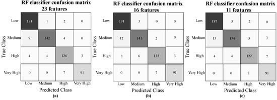 RF classifier confusion matrix for (a) 23 features, (b) 13 features (c) 11 features.