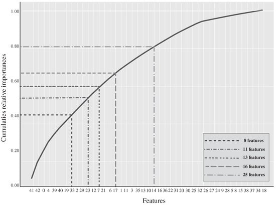 Regarding the feature reduction used, it was essential to consider the feature importance properties for the initial RF model. The feature importance property measures a relative weight value to each feature, which represents a direct relationship with the importance of the corresponding feature for this classical machine learning model. Figure 5 presents a cumulative graph which represents the relative importance values obtained for each feature, sorted from the highest to the lowest values.