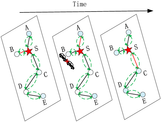 Traffic speed prediction is a typical problem associated with spatial–temporal data, especially in expressway or highway scenarios. Expressways are relatively closed and have a high-speed traffic flow, and their traffic data are generally collected from numerous detectors scattered in different locations. The change in traffic speed is not only affected by the vehicles in the target location but is also related to the vehicles converging from the adjacent locations, and the impact of each neighboring location also changes as time goes by. As shown in Figure 1, each node denotes a detection location, and each edge represents the connectivity between locations. Comparing with other neighbors of location S, location B is the nearest neighbor and has a greater impact on location S, but when there is a traffic jam caused by a collision in location B, the impact of locations A and C on S will be greater than location B as time goes on. Thus, the spatial–temporal correlation of traffic data is complex and highly dynamic, and it is a great challenge to extract the spatial–temporal correlation from traffic data.