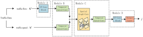where is the output of module C, and and denote the spectral kernel and the temporal kernel, respectively. As shown in Figure 2, modules B and C together represent an ST-Conv block, and this block also includes two temporal convolutions and one graph convolution.