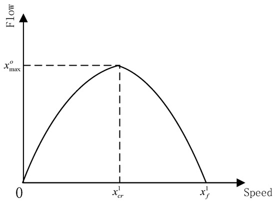 where is the traffic speed when the number of vehicles is small and every vehicle can travel at a free speed, and is the vehicle density when the traffic network is seriously blocked. Additionally, the relationship between traffic flow and speed is illustrated in Figure 4.