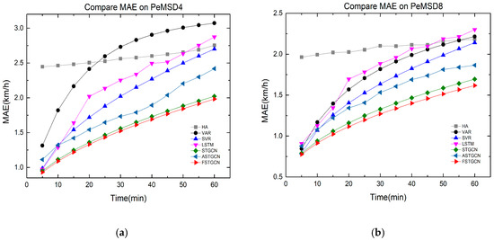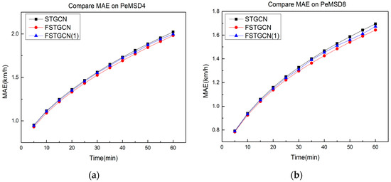 Figure 6 further shows the performance of our model, FSTGCN, and STGCN in 60 min on the two new test sets. The model FSTGCN reduces the MAE by at least 18% on test set PeMSD8. It is obvious that our model, FSTGCN, achieves a good improvement.