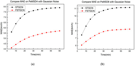 Further comparison on test sets with Gaussian noise. (a) PeMSD4. (b) PeMSD8.