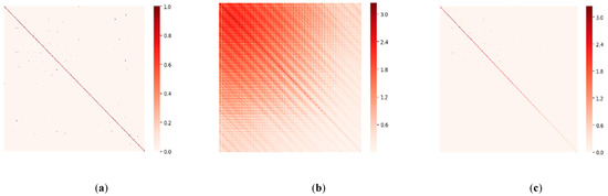 Different adjacency matrices in PeMSD4. (a) Distance adjacency matrix. (b) Covariance adjacency matrix. (c) Dynamic adjacency matrix.
