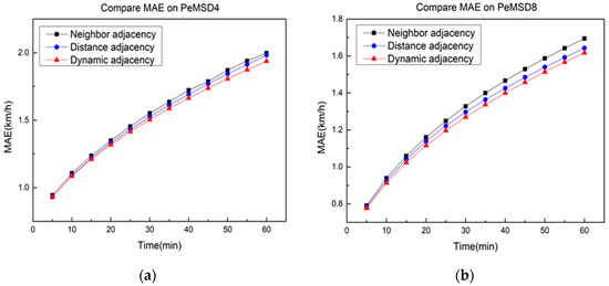 Except for the predicted traffic flow in module A, the dynamic adjacency matrix fusing with the traffic flow data also benefits the prediction accuracy of the traffic speed. As shown in Figure 9, three different adjacency matrices are applied in the model FSTGCN on the two datasets. Similar results are obtained in that the dynamic adjacency matrix is better than the other two matrices, and its prediction error grows more slowly with the increase in the prediction time. When the traffic flow of the road segments changes in a large range, the dynamic adjacency matrix will be more obvious and effective.