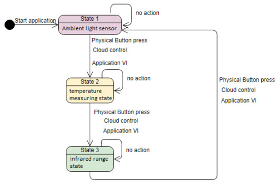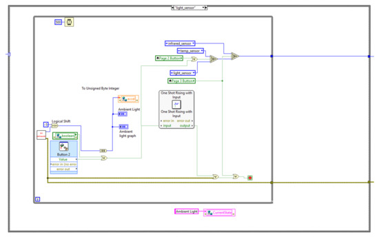 A LabVIEW project was created and the myRIO device was added to the project explorer. The LabVIEW code is implemented using a finite state machine. Each state corresponds to a sensor connected to myRIO: the first state is for ambient light, the second is for temperature, and the last is for infrared range measurement. The architecture of the finite state machine is illustrated in