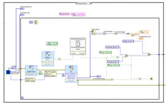 Figure 4 shows the temperature processing state. The I2C Init subVI contains part of the temperature measuring block diagram. The code will run in the temp_sensor state and only proceeds to the next when a button or switch is pressed. The VI measures the ambient temperature and stores the values in the global variable.