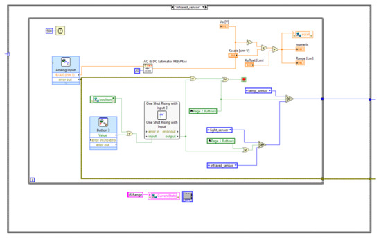 Figure 5 shows the Infrared measuring state. The AC and DC subVI contains part of the block diagram to measure the IR range. Any object can be used to vary the distance and observe the changes on the front panel.