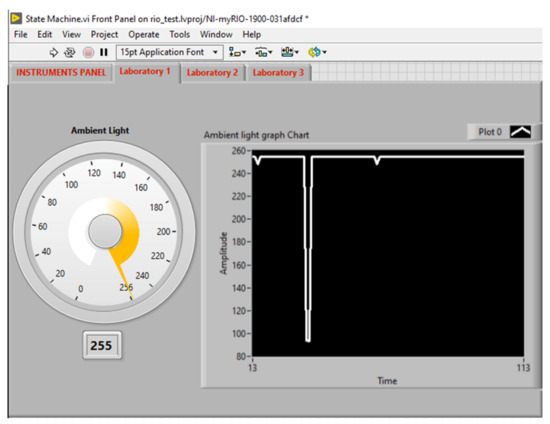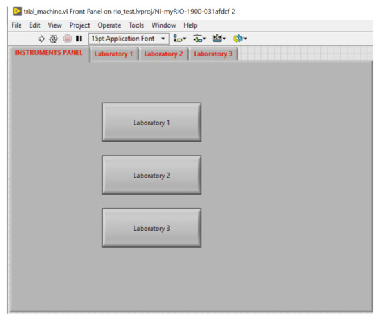 The front panel of the instructor’s LabVIEW application contains four tab elements, one main panel to choose from the laboratories, and three tabs that are used to acquire the values from the myRIO sensor node through Wi-Fi.