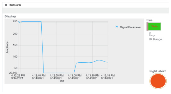 Figure 17 shows the SystemLink Cloud web interface, which displays the values of the sensor on the graph. Depending on the state of the myRIO device, the axis of the graphic can automatically adjust to display either ambient light, temperature, or range value. The timeline for each sensor is shown in
